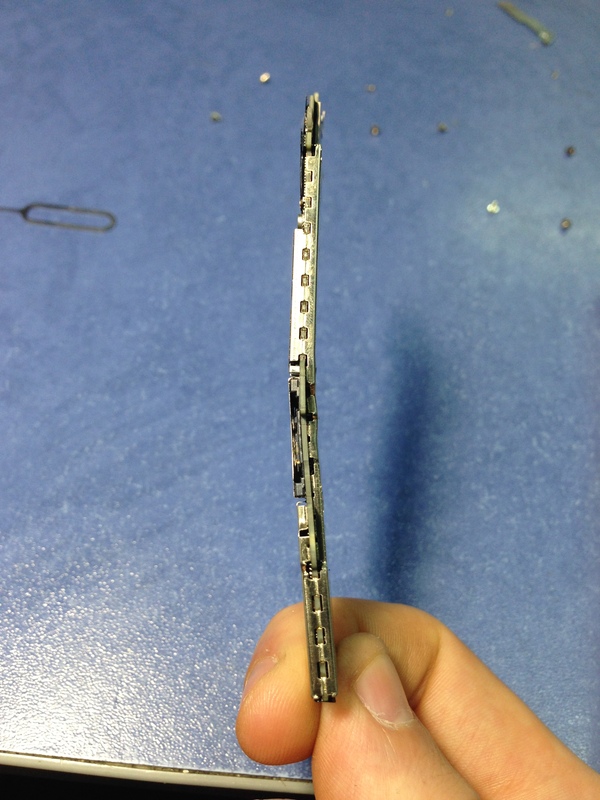 Было решено не менять ничего, а просто поставить эту плату в другой телефон с мертвой платой. Самое страшное было, когда устанавливал плату в корпус, поскольку она кривая, а корпус ровный. Был риск что после того как она станет на место в новом корпусе, она перестанет работать, ибо контакт между элементами и платой пропадет или появится трещина в самой плате и её слоях.