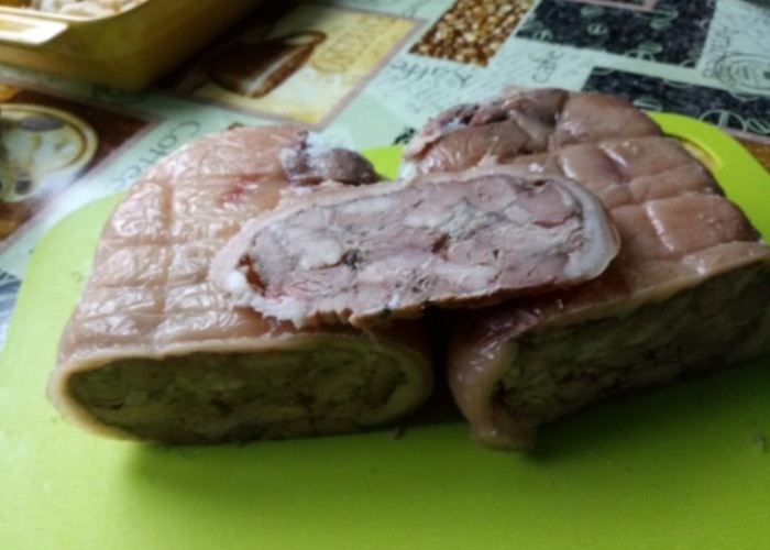 Берется свинная рулька. С нее аккуратно снимается кожа. Полотно кожи просаливается и дальше слоями на нее выкладывается мясо этой же рульки плюс куриная грудка. Но также делали и чисто из свинины. Каждый слой мяса покрывается чесноком и смесью специй.