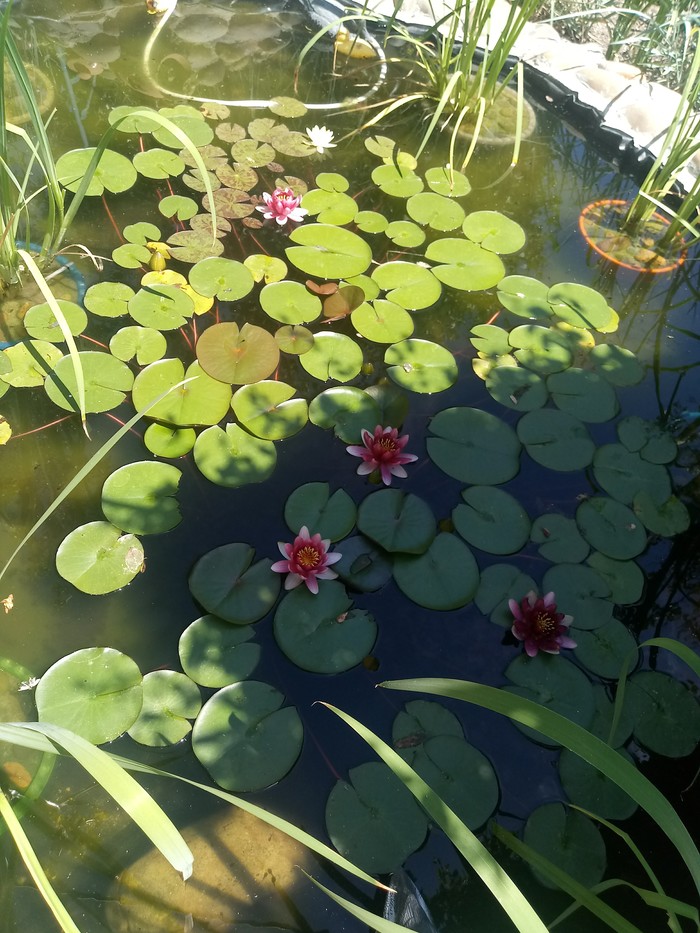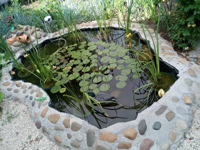 Пруд сложили самостоятельно, теперь там живут гуппики) запустили два десятка весной, а в зиму забрали три аквариума)))