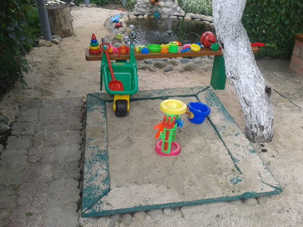Рядом с прудом для малышни папа из старых подоконников сколотил песочницу)