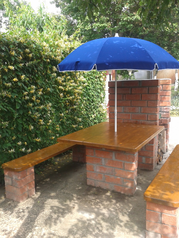 По примеру из журнала по садоводству сложили такой стационарный мангал) боялись, что без вытяжки не будет тяги, но это были беспочвенные опасения)) жарим и мясо и сосиски и овощи)