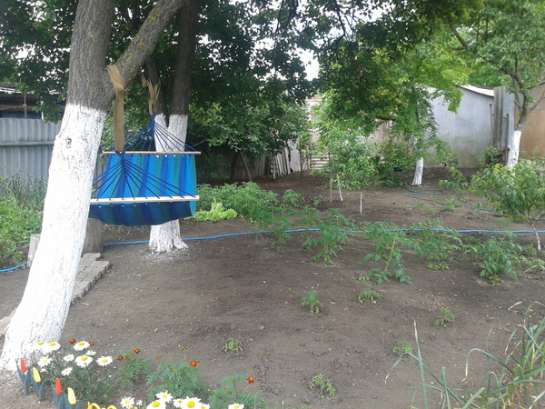 Также для отдыха под деревьями гамак( фото старое, теперь рядом с ним лавки из кирпичей).