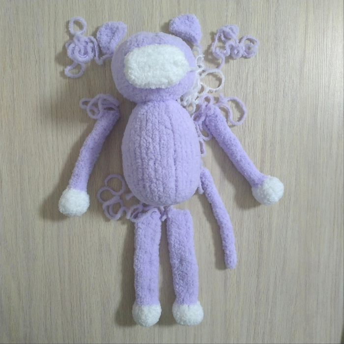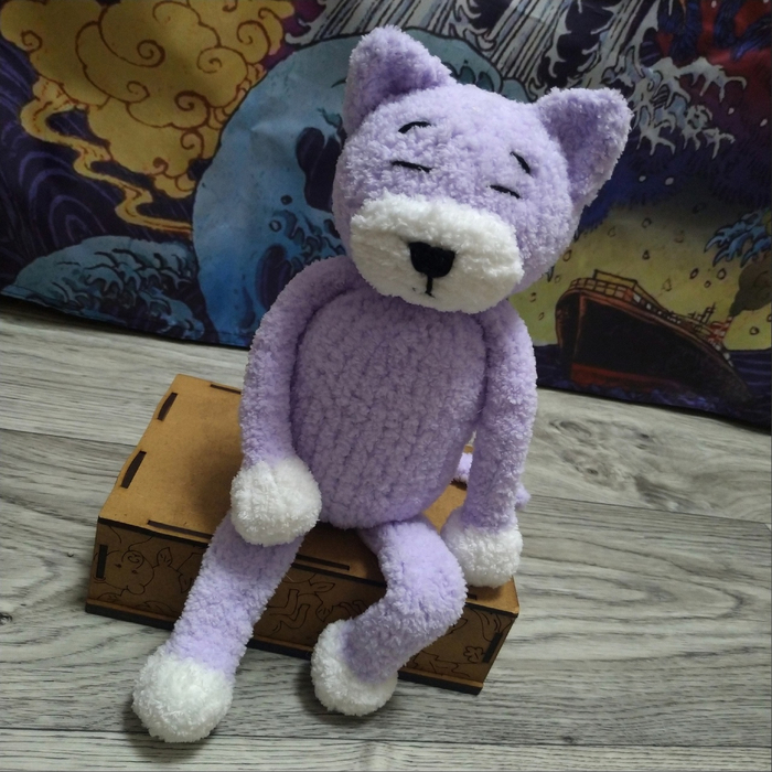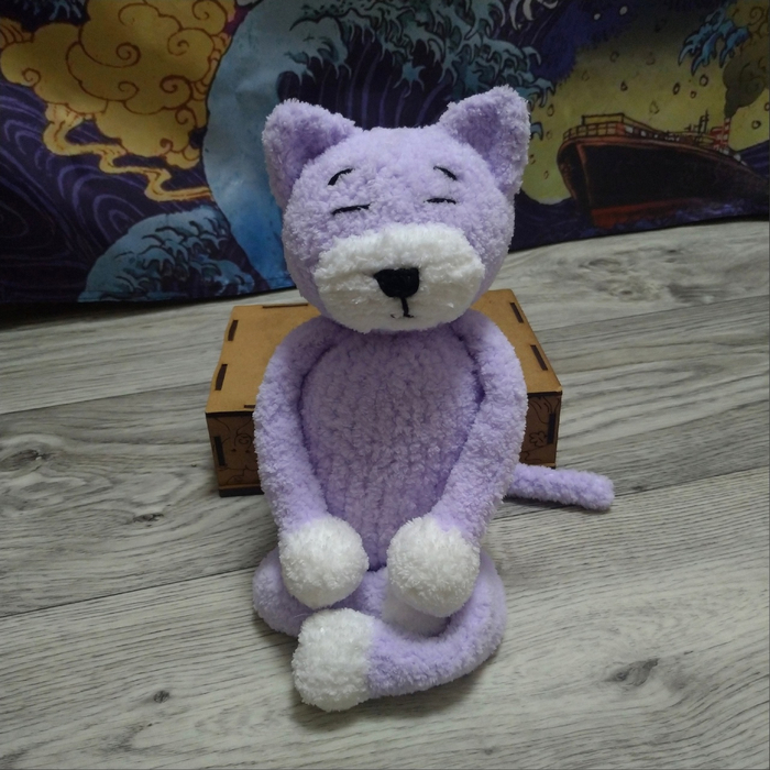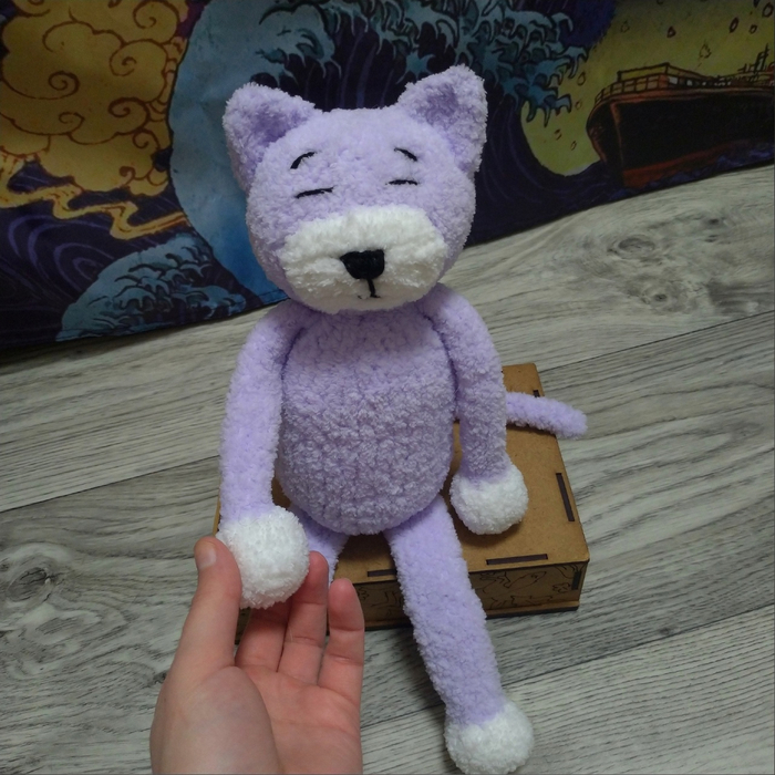 В моем случае на одного кота ушел моток Alize Softy основного цвета + немного белого же Alize Softy для лапок и морды, и какая-то безымянная гладкая черная пряжа для вышивки мордочки.