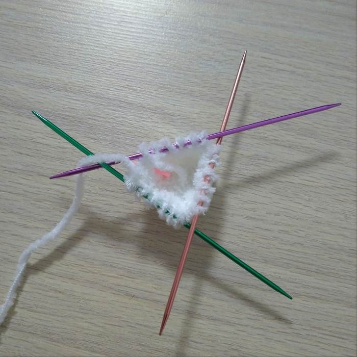 Вязание происходит на трех спицах, четвертая сменная для вязания: