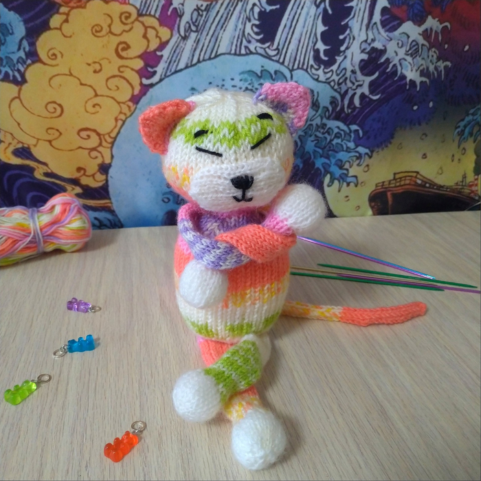 Кот вяжется целиком спицами. Поэтому если вы совсем не дружите с крючком, но аминеко хотите - это описание для вас.