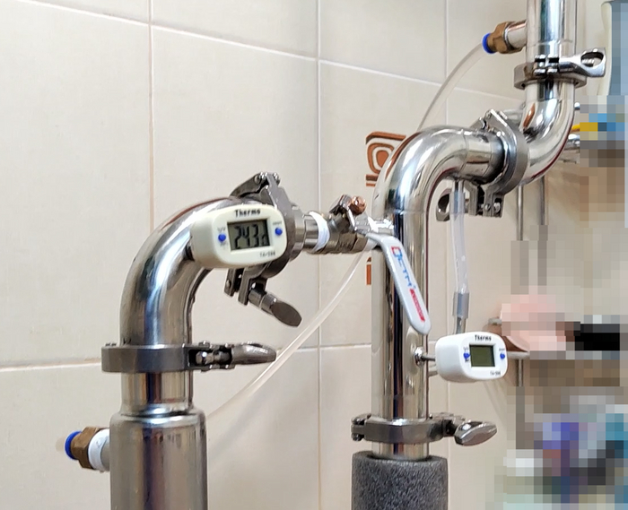 Далее я стал отбирать тело и в качестве эксперимента после 90 градусов чуть-чуть приоткрыл дефлегматор. В струе было около 80 градусов. Так я имитировал шлем (да, наивно, но хотелось посмотреть что будет - у меня все время 91-92 градуса на бражной колонне получается).