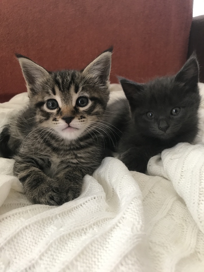 Знакомьтесь. Кодовые имена - Бонни и Клайд. Серая девочка, полосатый мальчик. Им сейчас 3 месяца. Размером пошли в отца. Приучены к лотку, едят сухой корм. Не боятся фенов, пылесосов и прочей шумной херни. Очень ласковые, игривые и социальные - спокойно идут на контакт с посторонними людьми. В общем, мимимишки и няняняшки.