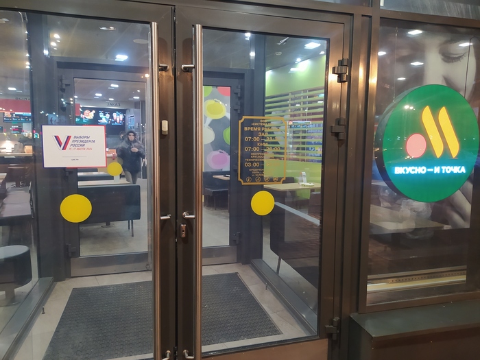 С каждым днём, кажется, что рекламы президентских выборов в марте вокруг становится все больше и больше. Рекламные баннеры на улице призывают прийти проголосовать, листовки на работе напоминают, что 17-го марта будут выборы президента, листок в подъезде тоже мозолит глаза слоганом про предстоящего электоральное мероприятие. Но, сегодня я был очень удивлен, увидев рекламу выборов даже на дверях фастфуда "Вкусно и точка". Видимо, хотят, чтобы и молодежь, которая составляет основной контингент подобных заведений, тоже поучаствовала в выборах, все ж, будущее на ближайшие шесть лет выбираем, а не абы что, надо, чтобы как можно больше граждан проявили свою гражданскую позицию и проголосовали за своего кандидата.