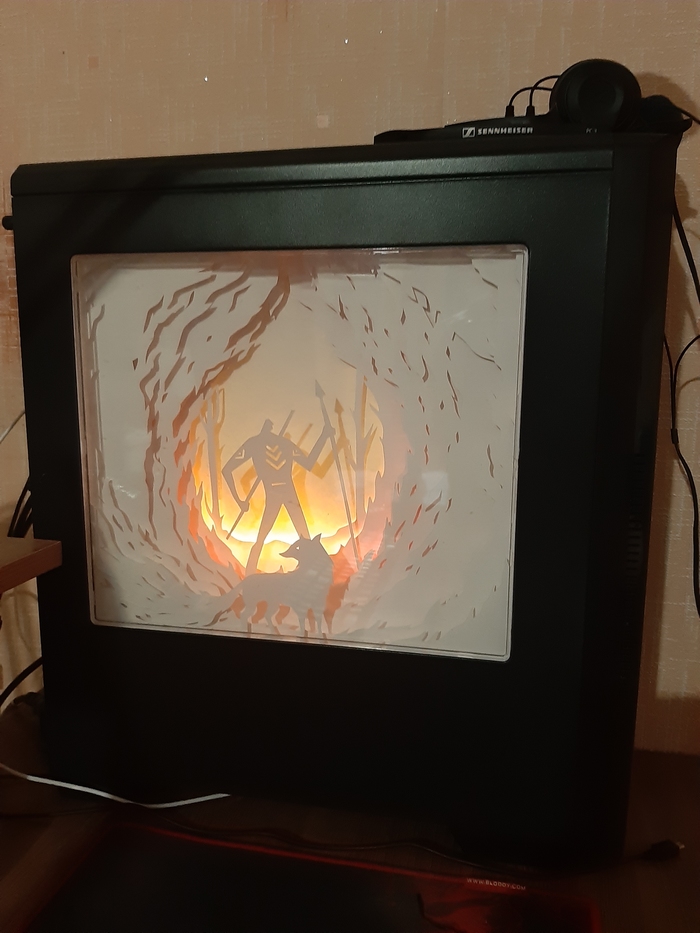 Для начала я приобрел светодиодную ленту с Молекс-соединением, потому как RGB порта на моей материнке нет. Снял размеры окошка и осознал, что размер не стандарт, а значит на обычном принтере формата а4 сам я распечатать не смогу, поэтому обратился к @GreenMongoose, работающей в типографии, с вопросом о печати, на что мне было предложено заодно и попробовать нарезать на плоттере, который у них имеется, сам рисунок. Тут нужно сказать, что это придало мне еще больше энтузиазма, раз самому не придется все вырезать. Не буду говорить, сколько занял у меня поиск подходящего рисунка (потому что я хлебушек, чтобы не то, что перевести в слои изображение, а банально придумать, из какого изображения сделать лайтбокс, поэтому я ограничился готовыми шаблонами в сети).