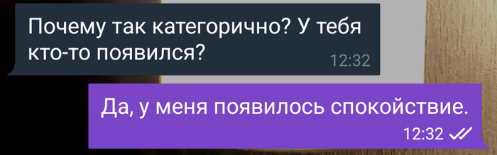 Ей в 16.00 надо было к подруге мне в 15.00 с детворой на событие там нас ждали. Быстро собрался на маршрутку. Пошли с детворой. Звонок. Мол она не успела и маршрутка перед ней проехала и что мол это за семья ее не подождали. Говорю тебе же к 16.00 надо было. Думал соберёшься не торопясь поедешь на таксе. Да ты и не говорила что с нами поедешь. Получаю в ответ какой сюр в трубку. Я уже в маршрутке полной. Говорю не буду это дерьмо слушать и что мол упреками не получится общения. И кладу телефон. Звонит орет. Говорит давай расставаться говорю давай. Так и расстались)