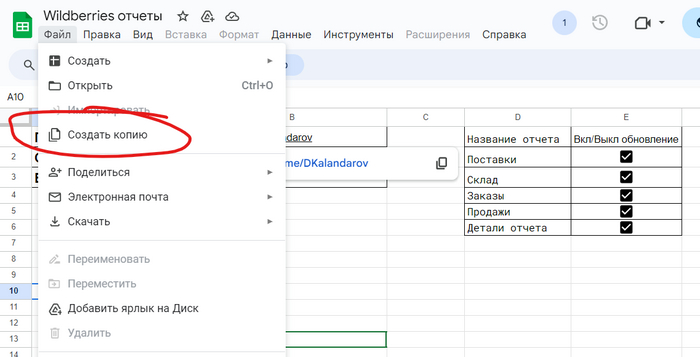 3) В меню выбераем Отчеты WB -> Обновить отчеты Wildberries