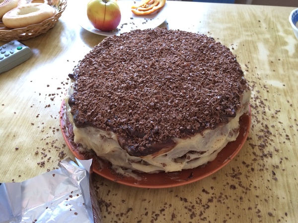 ...и решил украсить его надписью - кондитер я неопытный, поэтому решил использовать для этого сгущенку и вот (Там должна была быть надпись "Мой торт на др").