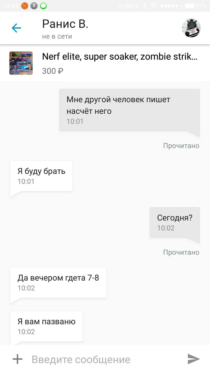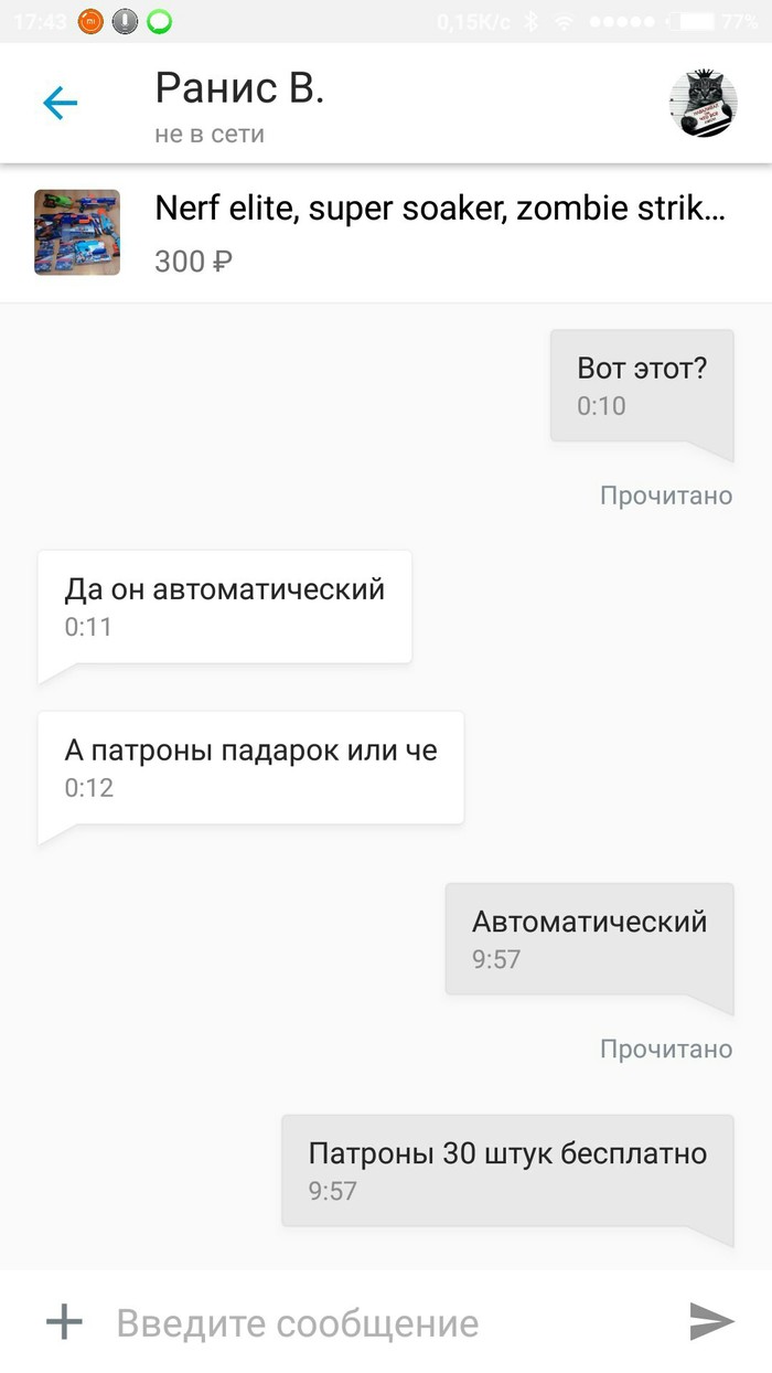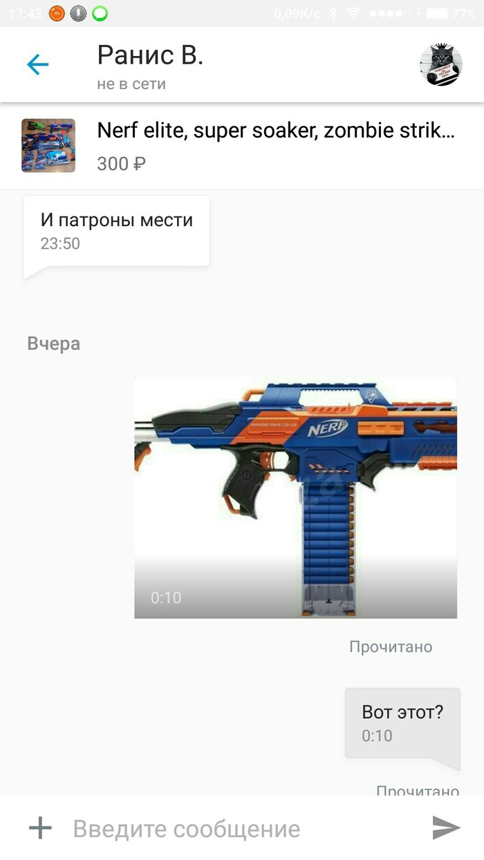 Пишет некто, интересуется бластером Nerf Elite Rapidstrike (автоматический бластер на батарейках, с регулирующимся прикладом, обойма на 18 патронов), продавал за 2500, что совсем не дорого за такую пушку (цену на рынке на данный бластер на тот момент не помню, но на сегодняшний день дешевле 4000 руб не найти, а максимальная цена 6-7 тысяч)