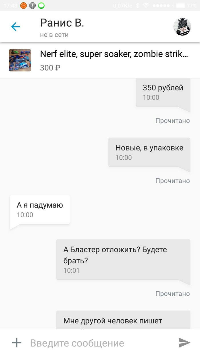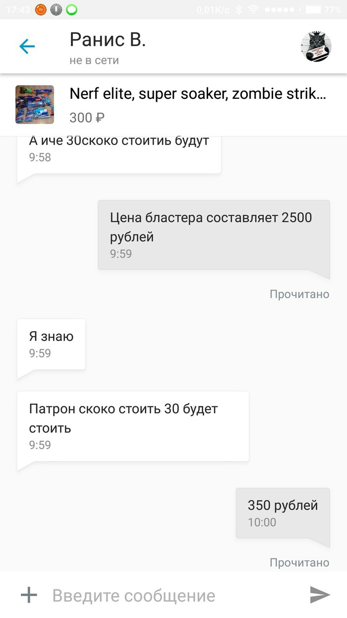 Я: *не понимаю что происходит* Так цена бластера 2500 + патроны 350, с вас 2850 получается, никак не тысяча. *в этот момент понимаю, что она имела ввиду своей купюрой* 300 это минимальная цена за самый дешёвый бластер, в объявлении же написано!
