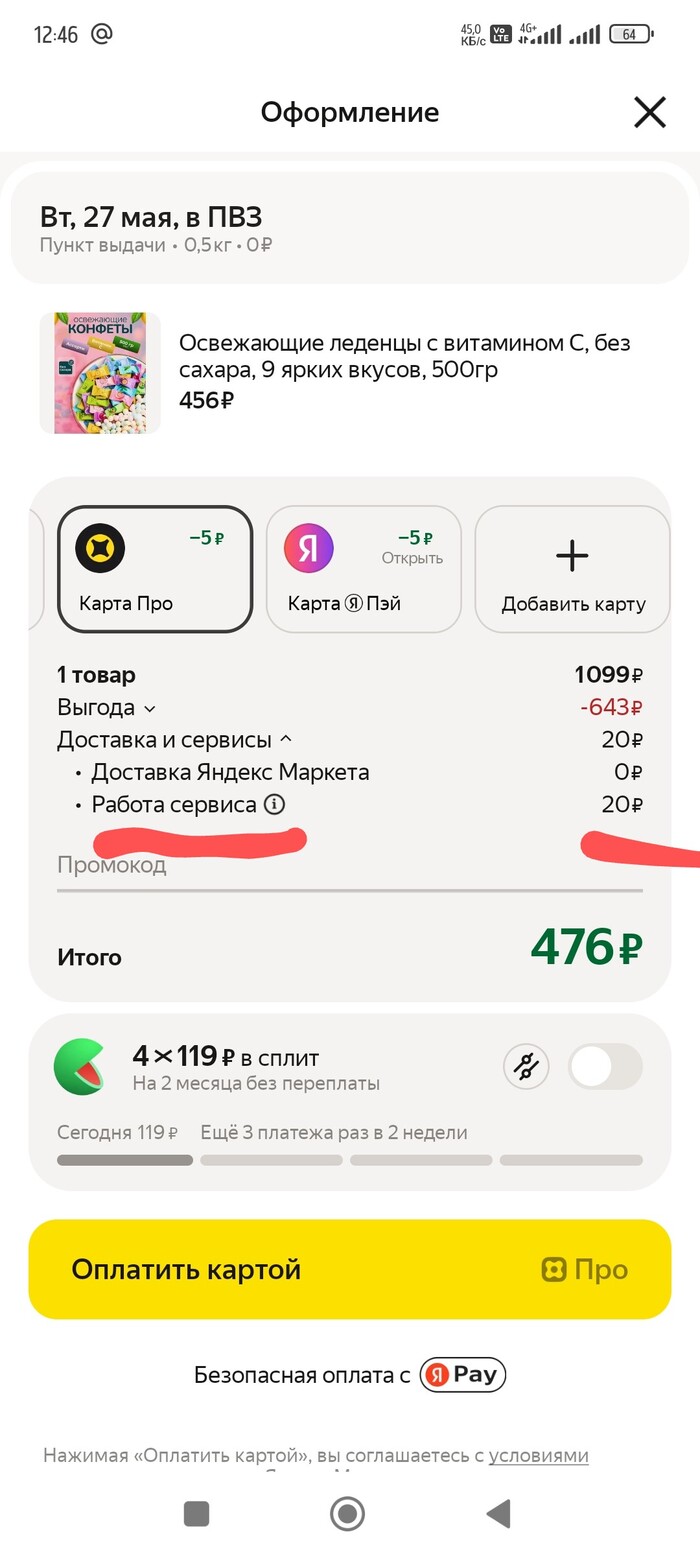 Ну и сразу думаю куплю конфеты. Начинаю покупать, опять цена меняется, раскрываю все скидки и прочее подробно и офигеваю.. Мало того, что на заправках сервисный сбор, из-за которого, отказался заправляться не посещая кассира, ибо пройти не далеко, а 20р каждый раз, хоть с пары литров, платить не хочется, так ещё и Яндекс Маркет решил брать такой же сбор, просто за то, что вы на их площадке что-то покупаете 🤬