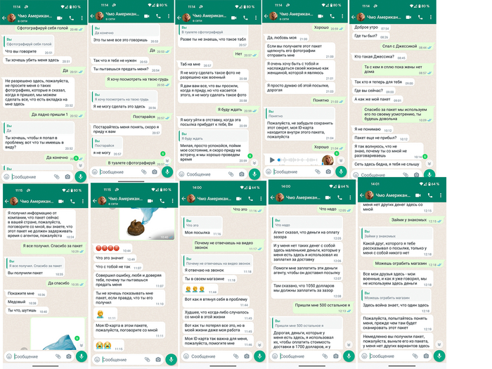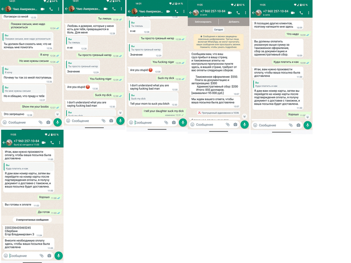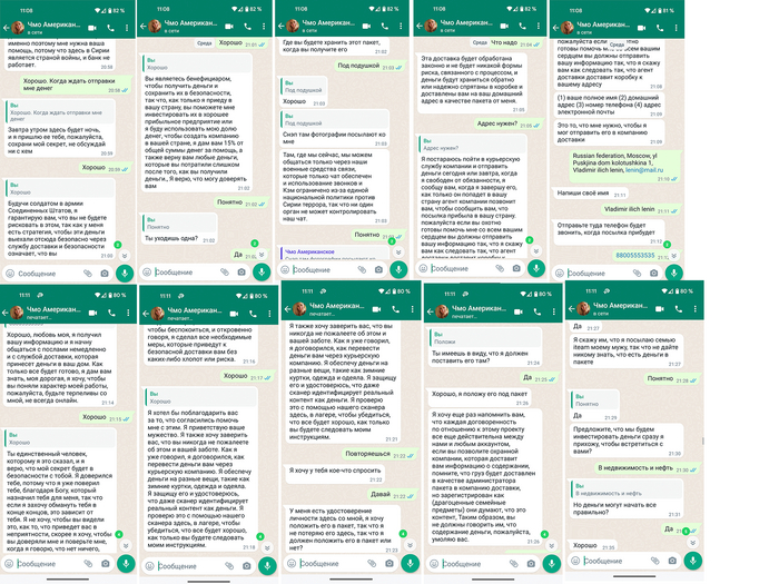 Втыкал я в поисках любви как вдруг постучалась красавица. Говорит мол нравлюсь я ей, давай дружить. Ну я и поддался. Легкий привет и предложила переместиться в вацап. Быстро поискав, телефон был из Сенегала. Оказалось она американка и служит в Сирии. Говорит нашла чемодан денег, и хочет мне их отправить, я конечно же согласился. Чемодан был готов и отправлен в тот же день, в тот же день он приехал в Россию. Деловая почта это вам не хуй собачий. Что бы получить его конечно надо заплатить за пересылку и оформление документов, и тут написало местное тело, тело предложило оплатить на карточку. (Позже сообщение с номером карты удалил).