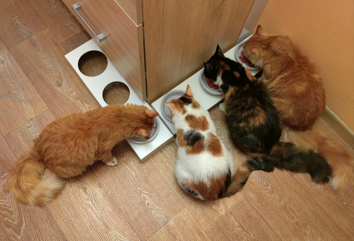 Кормить взрослых котов лучше 2–3 раза в день, в определённое время. Стабильный режим питания положительно сказывается на аппетите кошек, а также их физическом и психическом состоянии — помогает избежать стресса и переедания. Мои коты кушают 3 раза в день, в среднем миски опустошаются за 1–2 минуты.