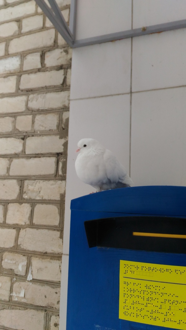 Под новый год пошел забирать посылку с нашей родной почты (мое почтовое отделение за домом находиться) и увидел при входе на ящике голубя белого, да еще птичка ни разу не испугалась. На почте про самого голубя спросил "Это что у вам теперь почтовые голуби опять в моду вошли?" Ну они посмеялись и сказали что голубь то прирученный, походу со свадьбы какой нибудь улетел и потерялся не долетев до хозяйки. Живет себе здесь и его местные подкармливают, никому вроде не мешает.