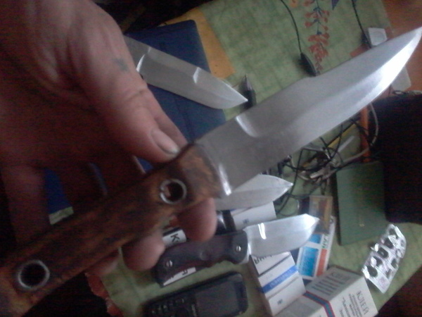 Сижу вот и думаю на досуге, шо в нём такого кухонного (?) планировался вообще-то типо тактический, или даже штык (длинна лезвия 160 мм, ширина 35 мм, толщина в обухе от 3х до 5ти мм, рукоять дерево неизвестной породы 130 мм, крепеж металлический люверс 9 мм ) Ну да ладно, если кто чего дельного подскажет буду только рад, а пока, три выходных впереди, на всяку мелочну доводку, всем друзьям доброго утра, и хорошего настроения.