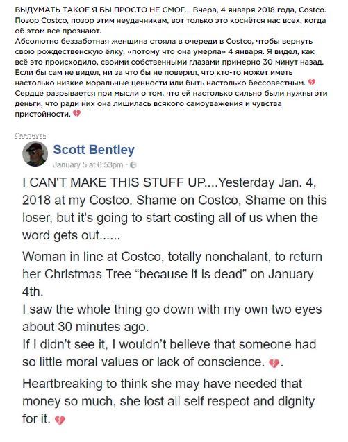 Клиентка американской сети Costco принесла рождественскую ёлку в магазин 4 января, потребовав возместить стоимость покупки, аргументируя это тем, что дерево умерло. К удивлению очевидцев, кассиры вернули женщине деньги. Более того, нашлись люди, утверждающие, что для Cosco такие случаи — почти рутина.
