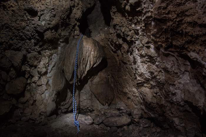 Тут провесили веревку, хотя можно было бы и своими силами спуститься. Но всё же, пещера завораживает, но и одновременно давит, заставляя быть осторожным.