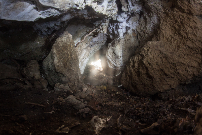 Войдя в пещеру, попадаем в узкий лаз, метров 10 здесь нужно проползти на четвереньках под уклоном вниз (фото сделано по направлению к выходу из пещеры).
