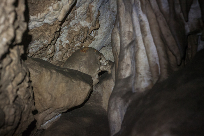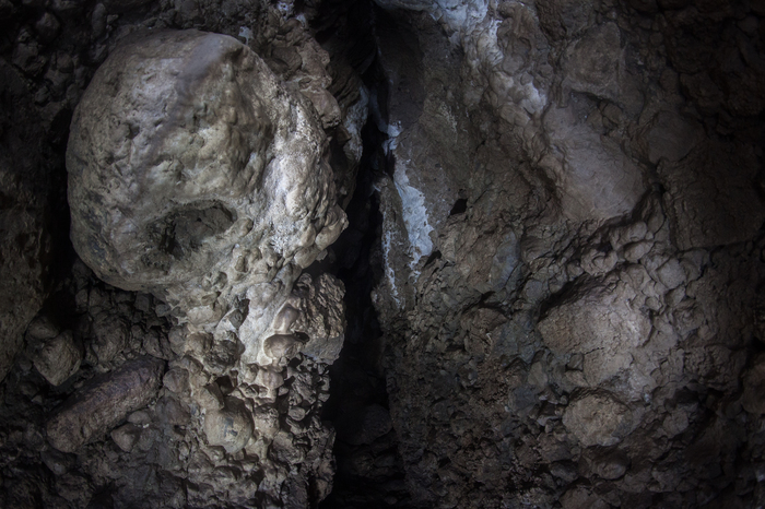 Тут мы добрались до "изюминки" этого места - человеческого черепа. Лежит он под потолком, нужно, слегка приловчившись, упираясь ногами, аки человек-паук, взобраться, чтобы приблизиться и разглядеть череп. Почитав статьи, поняли, что никто не знает, чей череп и сколько ему лет (сотен или тысяч).