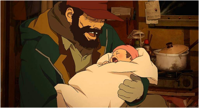 Вышедший на экраны в 2003 году фильм «Однажды в Токио» по праву можно считать классикой японского кинематографа, режиссёру которого, к сожалению, удалось дожить лишь до 46 лет. История получила название в честь фильма Джона Форда «Три крестных отца», в котором трио бродяг вынуждены заботиться о новорождённом.