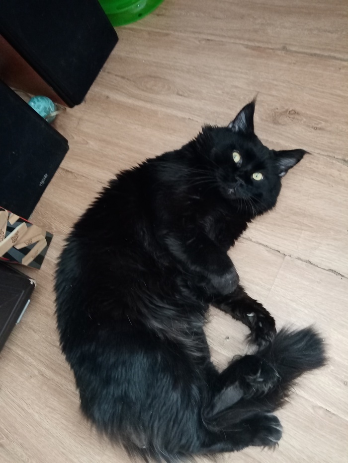 И вот я узнала о замечательной породе, Мейн -кун, мало того ,что я очень люблю кошек, так ещё и котята с фото смотрят на тебя со скептическим выражением лица черной и наглой морды))) Я бала покорена! Черных в помете было 6шт.-мальчиков и одна полосатая девочка.