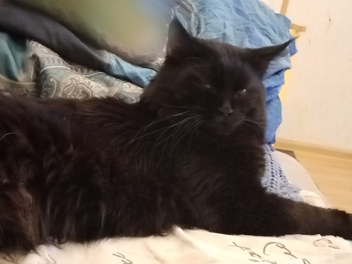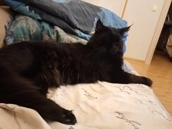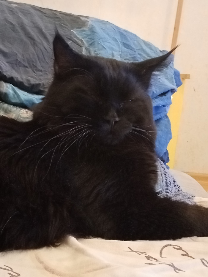 Кот Пух 1 год и 4 мес, вес 8500. Кошка примерно 12 лет ( забрали к себе после пожара у соседей, какая была, такая и осталась, только шерсть, что обгорела стала чёрной вместо рыжекоричневой) сравните размеры, перед тем, как решитесь завести Мейн-куна)