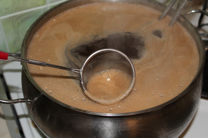 8. Не мешкая ,ставим кастрюлю с суслом на плиту. Когда закипит - снимаем пенку - она не нужна. Кипятим один час.