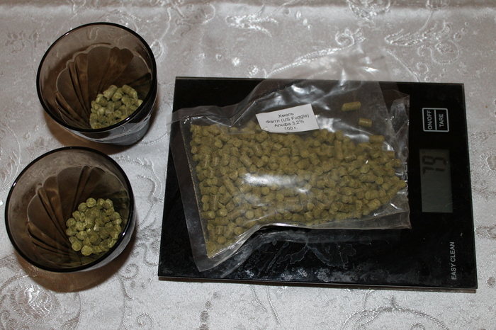 9. После снятия пенки бросаем в кастрюлю 7 г хмеля Nortern Brewer. За 15 минут до конца кипения добавляем 9 г хмеля Fuggle. Порция хмеля в начале кипячения - для горечи, в конце - для аромата (звучит как 10 повторов - на массу, 15 - на рельеф :) Можно бросить как есть, а можно, поместив хмель в бумажный мешочек или обрезок колготки. Тогда сусло будет чище после розлива.