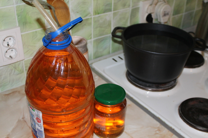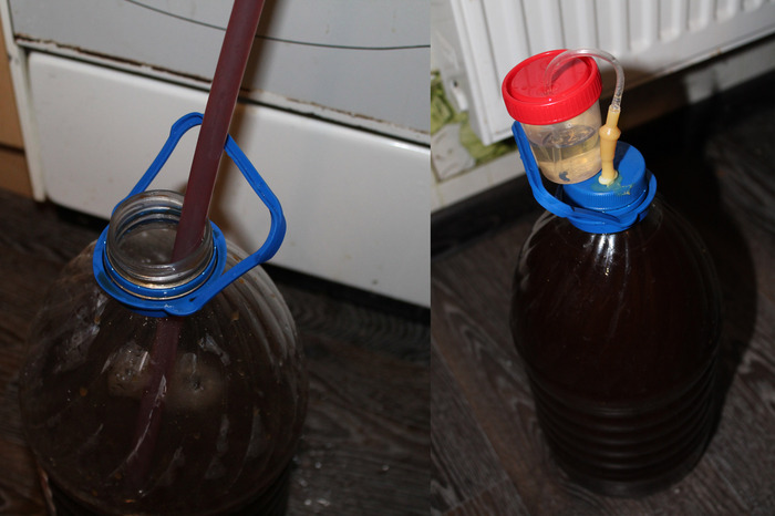 12. Сусло остыло. Выливаем йодную воду. Переливаем из кастрюли по шлангу сусло в бутыль, избегая разбрызгивания и контакта жидкости с воздухом, чтобы не подцепить бактерий, которые испортят вам всё пиво. Затем добавляем из банки сусло с дрожжами и плотно закрываем гидрозатвором. Гидрозатвор заполняем водкой или йодной водой.