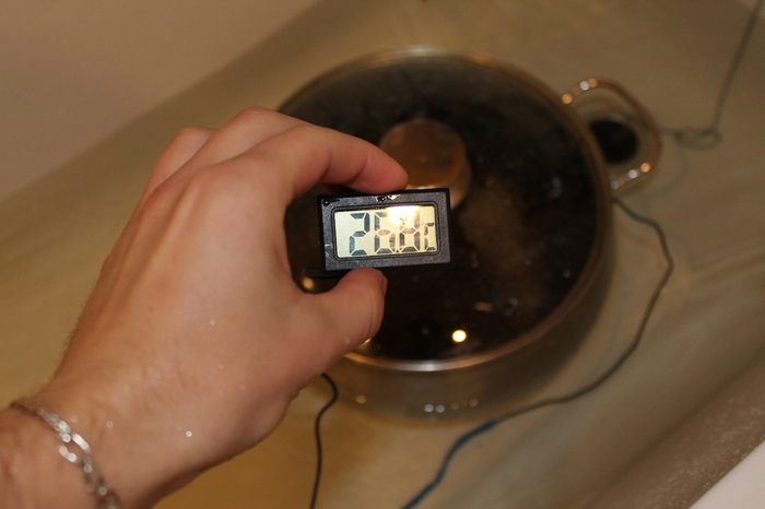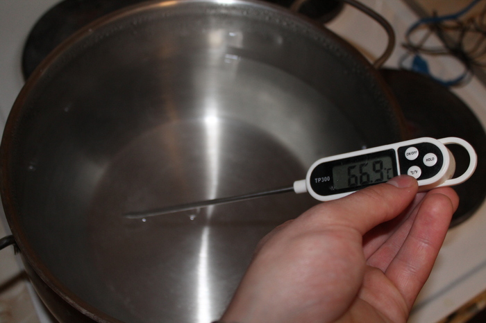 1. Нагреваем воду в кастрюле до температуры (74 С).