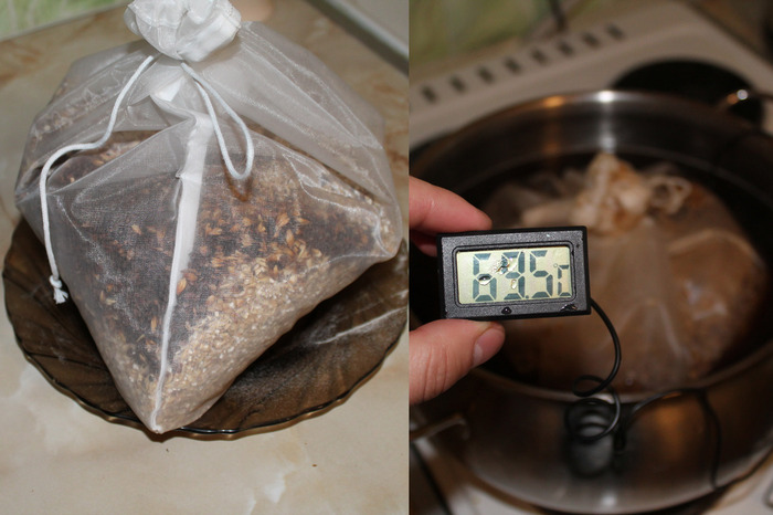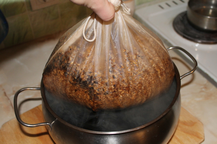 3. Вариант 1. Засыпаем весь солод в нейлоновый мешок, завязываем, и мешок погружаем в воду - так будет чище и проще. Вариант 2. Засыпаем солод напрямую в нагретую воду, а мешок будем использовать позже при фильтрации сусла от мусора - это будет грязнее, дольше, но тут наверняка весь солод провзаимодействует с водой, и вы получите более качественное сусло (сусло - это отвар из солода).
