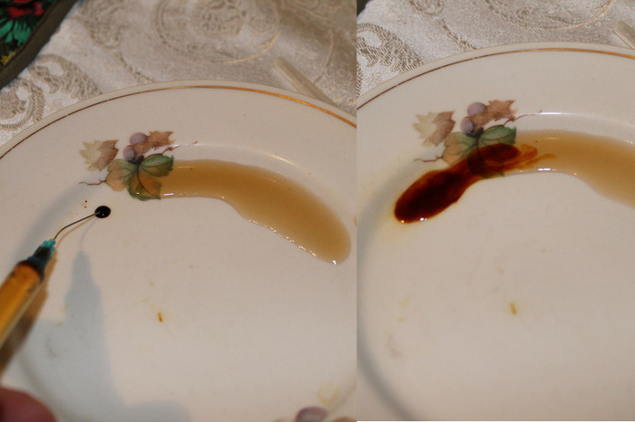 6. Спустя час, делаем йодную пробу. Для этого несколько капель сусла на тарелочке смешиваем с парой капель йода. Если цвет сусла не изменился , то вы всё сделали правильно. Если сусло изменило цвет на синий, или фиолетовый, значит там ещё остался крахмал, и вам надо ещё раз перемешать сусло, и выдержать дополнительно 10 минут.
