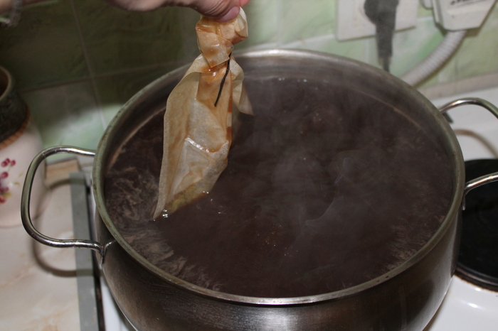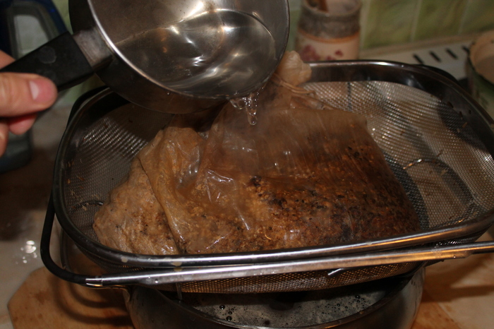 Если вы пошли по сложному и правильному пути (вар. 2), то переливаем сусло в пустую кастрюлю через мешок и дуршлаг, в результате мешок наполнится солодовым мусором. Этот мешок надо будет также промыть водой до получения 6 литров сусла. Это дольше, но качественней. Если на этом этапе вы уже прокляли тот день, когда решили сварить пиво и думаете, что ну его нахер, лучше бы в магаз за Жигулями сходил - кухня была бы целей, то вы на правильном пути. Фильтрация - это самый тяжелый процесс. Я его тоже не люблю.