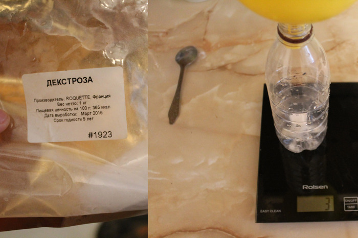 2. Сливаем йодную воду и засыпаем в каждую бутылку декстрозу (можно сахар от безысходности) из расчёта 5 г на литр пива.