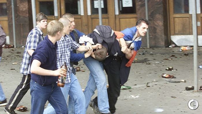 — Начали все «карлики» — подростки от 13 до 17 лет, — продолжал Андрей. — В перерыве они, и без того пьяные, добавили еще и с новыми силами бросились на тех, кто пытался им противостоять. Из-за того, что большинство организованных фанатов — равно как и милиция — на Манежной отсутствовали, молодые воспользовались безвластием. Их было где-то две трети от общего числа присутствовавших на площади. Они считали себя патриотами — а сами громили Москву. Небольшая часть «карликов» пошла даже на Красную площадь. На подступах к ней охрана их все-таки остановила, и больше попыток повторить штурм не было.