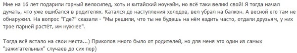 Я писал вот этот комментарий про велосипед, но в нём есть маленькое послесловие: до маман всё же дошло через несколько недель, что нехорошо как-то с велом вышло. Мне в качестве извинения приготовили вкусный ужин... по их словам вкусный, потому что когда я пришёл домой, его уже съели :D