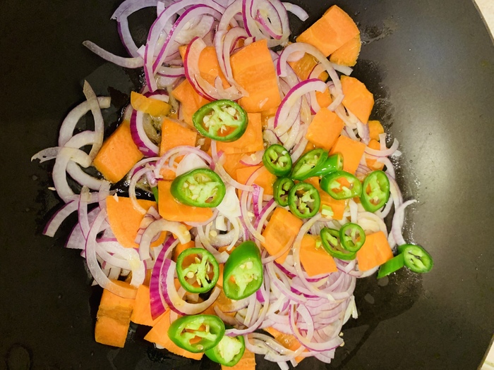 на кунжутном масле обжариваем лук, морковь и чили пару минут