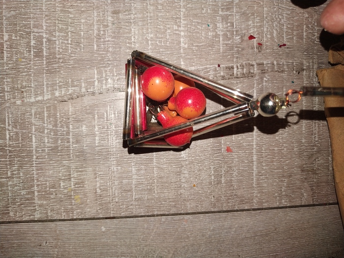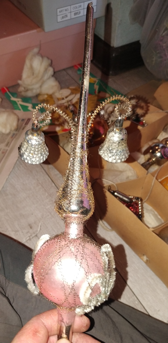 Шпиль на макушку из ГДР, выглядит необычно, особенно колокольчики на его вершине. При чем, проволока которая оплетает шпиль не закреплена клеем или чем то другим, колокольчики же держатся за счёт проволоки которая оплетает другую проволоку.
