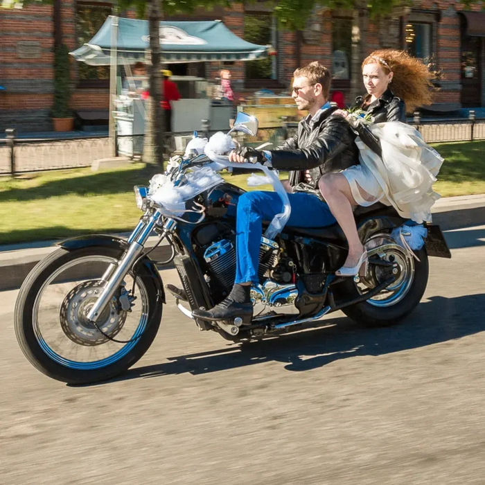Но мотожизнь, как и все формы жизни умеет в эволюцию и вот категория А и номера наконец получены, начались ерофейно кофейные движения, покатушки по городу, немного за городом. Вобщем обычная жизнь кофейного байкера .Которую мы разбавили свадьбой. И нашим лимузином был Honda Steed 400. Самые внимательные могут разглядеть свадебные кольца, которые были изготовлены из каких то подвесов для полотенец.