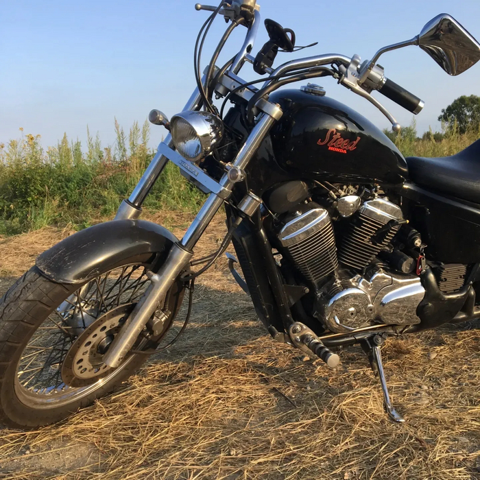 Вот ОН! Мой первый мотоцикл. Всегда думал, что мотоцикл должен быть железным и блестящим. Honda Steed 400. Обьем двигателя 400сс. Без пробега по РФ. Прямотоки голые трубы, занижен немножко. Причем изначально я ехал смотреть другой Steed, красный, но выкатив оба мотика на дневной свет я сказал так, красный закатывайте обратно, черный заверните. Так и зародилась мотожизнь.