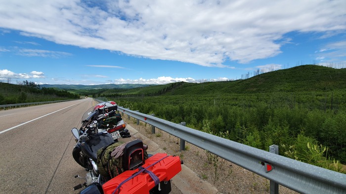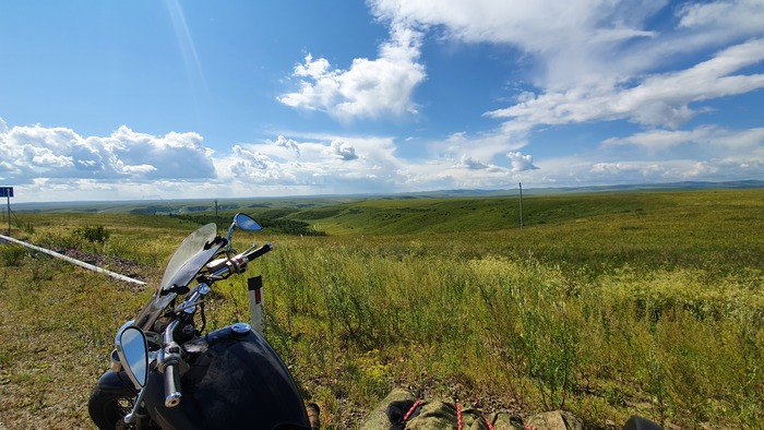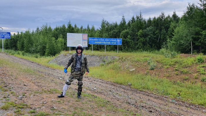 В Забайкальский край я въезжал, уже похожий на бывалого мотопутешествинника. Пакеты с ног я перед фото снял. xD