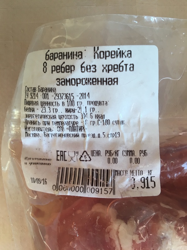 Захотелось мне тут давеча каре ягненка отведать. Окей, идем в магазин выбираем ребра от компании "Платира". Вот такой. История вкуса, будет вам история сейчас.