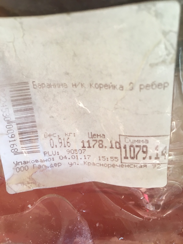 О, еще какая то наклейка. Похоже на наклейку местного фасовщика. Ну-ка, что тут у нас? Таааакс, 8 ребер, потяжелело на грамм,ну да шут с ним.Грамм больше, грамм меньше, это ж не коньяк за грамм тут пост пилить. И цена появилась, целых 1178.10 за кило и в моем случае 1079,14 за 916 грамм.