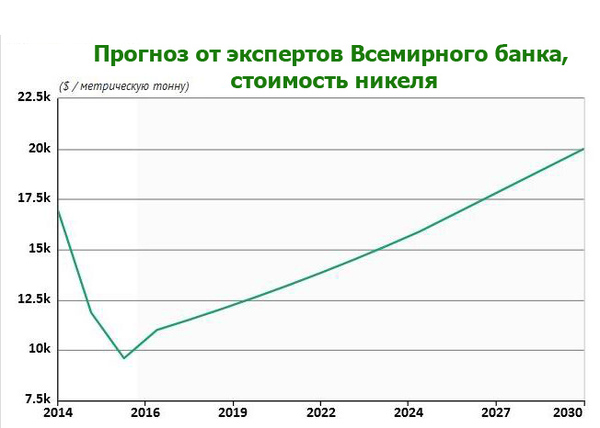 Снижение стоимости никеля было связано с падением спроса на нержавеющую сталь. Однако этот металл является универсальным и используется в том числе при изготовлении аккумуляторов для производства аккумуляторных ячеек и контактных пластин. В период до 2030 г. спрос на никель будет расти. По данным Bank of America Merrill Lynch, к 2030 г. потребность в никеле составит примерно 250 тыс. тонн, против нынешнего потребления 20 тыс. тонн в год. Это приведет к подорожанию металла примерно до $15 тыс. за тонну уже через 5-6 лет.