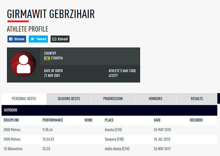 В профиле на сайте Международной федерации (IAAF) указано, что эфиопка родилась 21 ноября 2001-го – а значит, еще пару лет Гебрзихаир может выступать среди юниоров.