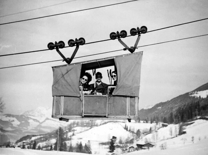 Такой буксировочный подъёмник функционировал в швейцарском Гштааде (1940 год)